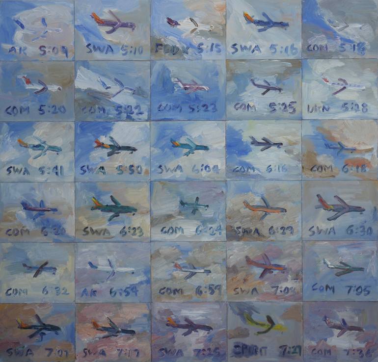 On April 11, 2022, I painted the airplanes landing into Burbank airport from my backyard. I live streamed the event on my YouTube channel Letspainttv. 30 canvas panels mounted onto a wood frame.
