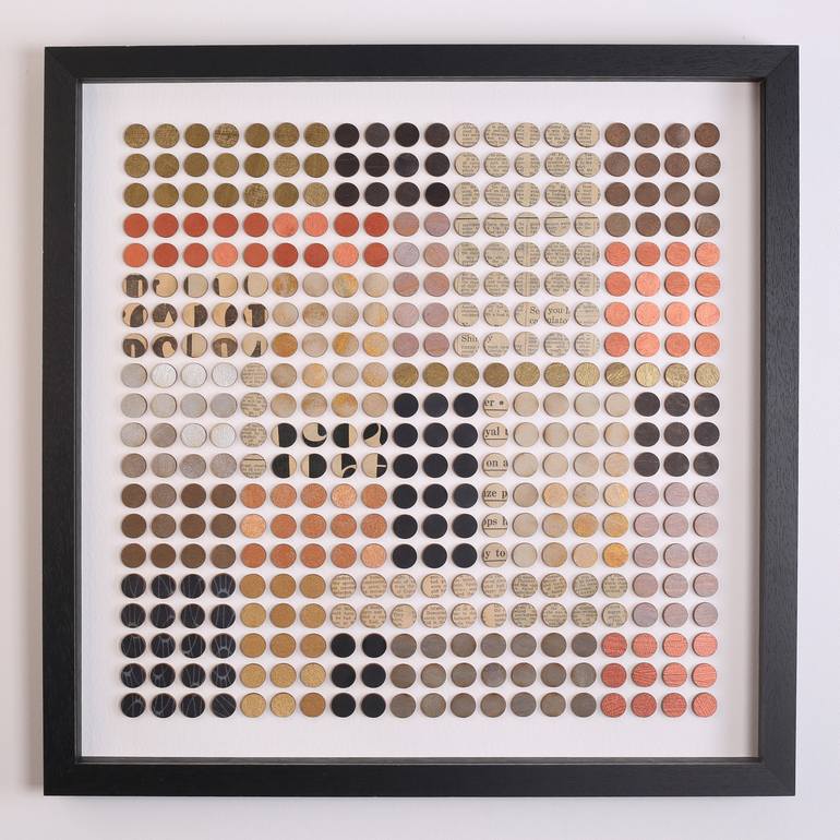 This mixed media collage was made using vintage newspaper typography collages onto wood alongside acrylic and ink painted panels. These painted and collaged sheets of wood have then been cut into dots and assembled in this geometric composition. Gold, taupe, copper and black paint worked in within...