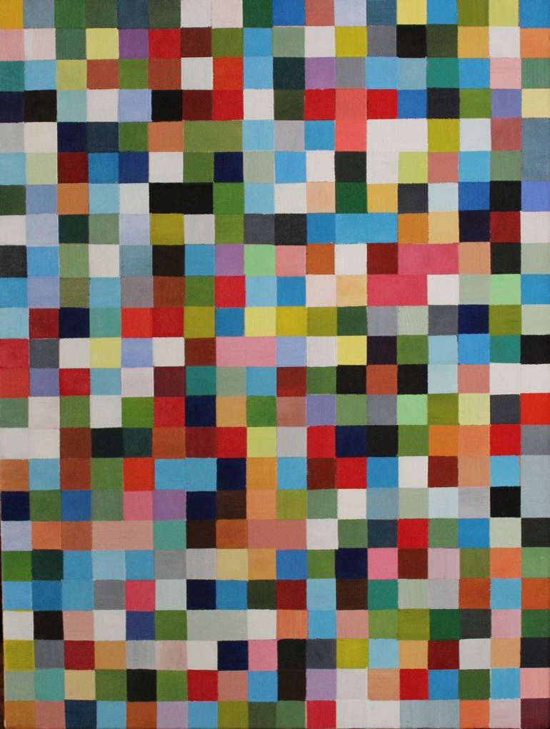18 x 24 inch acrylic on canvas. Comes signed on the back, and wired for easy hanging. This style was pioneered by the great Gerhard Richter, in the 1970s. Each color is assigned a number, and a string of numbers is obtained using a random number generator. The squares are filled in according to t...