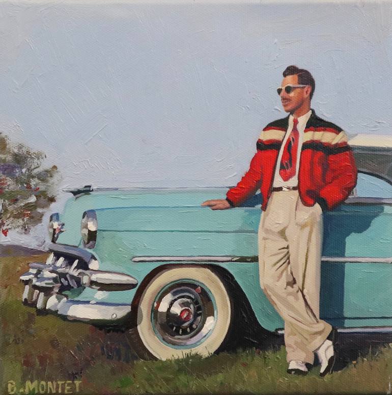 Dans cette œuvre , Benoît Montet a capturé l'essence des années 50 avec un style qui allie réalisme et pop art. Devant sa Chevrolet 1954 cet homme élégant représente le style caractéristiques de l'époque, et une certaine joie de vivre. La peinture est protégée par une fine couche de vernis et encad...