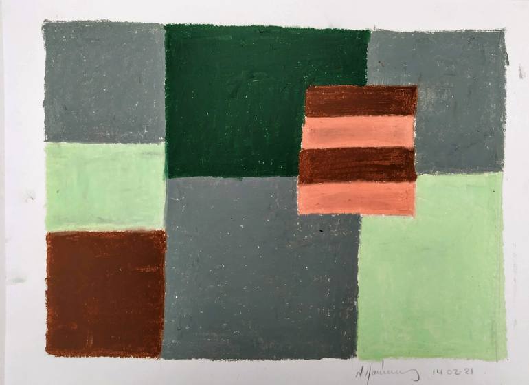 A3 size 29 x 42 cm ( 11,4 x 16,5 in), oil pastel on paper, 2021 With my work being geometrical, my main worries are about limits. In this new series, I'm dividing the landscape. At the same time, the question is raised about unity and its part on the whole with the color on a key role.