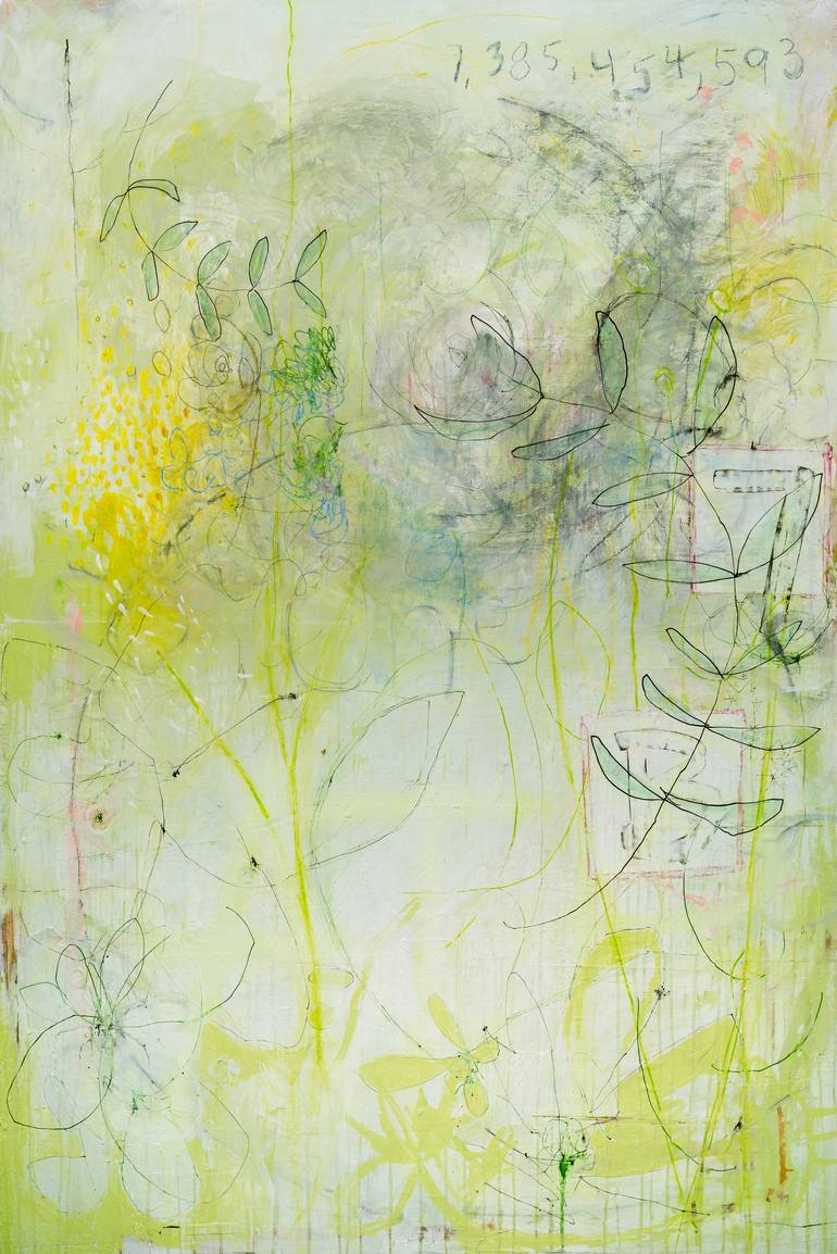**SOLD** Extra large abstract contemporary painting; oversized graffiti on canvas. Light green and white botanical inspired art for industrial loft, modern space or urban / street graffiti interior design. Numerous paint layers and paper collage elements create interesting textures. Satin varnished...