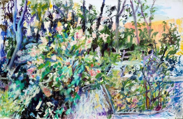 This plein air painting was made primarily in situ. My working method is to spread my large canvas on the ground and over the course of multiple sessions build up the image. Between sessions, the canvas is rolled so it can be easily moved. The medium is oil paint and oil stick. Later the painting w...