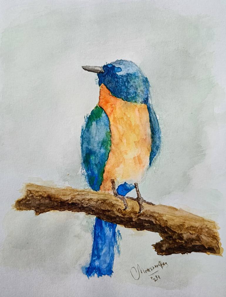 A Bird 🕊️ without Eye. Watercolor painting by Moazzambeg Mirza. A delicate watercolor painting of a vibrant blue bird perching on a branch. 🐦 I captured the soft, airy brushstrokes and whimsical spirit of this little feathered friend.