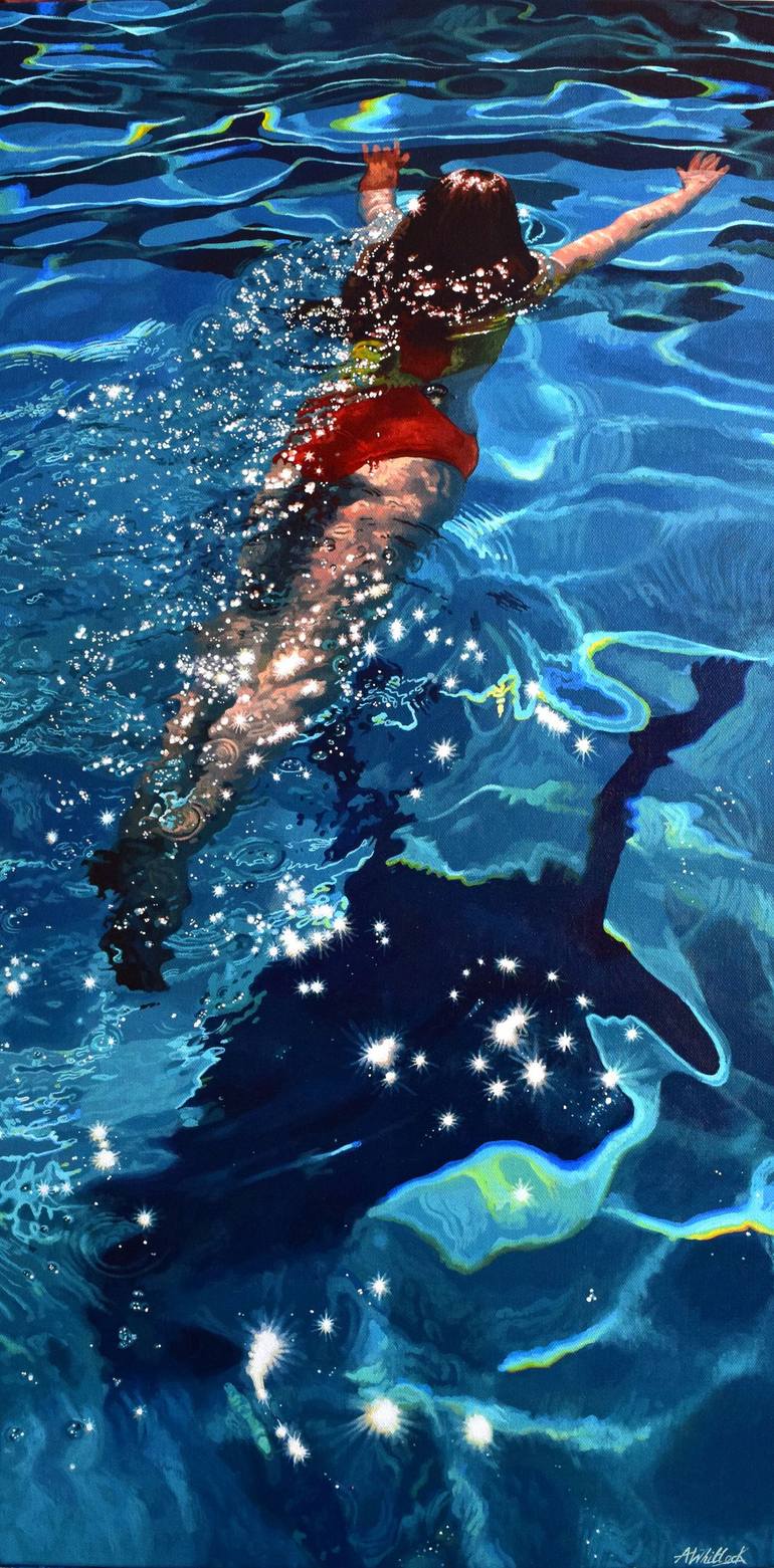 Abi Whitlock's work focuses predominately on the human form and how the mind and body are affected when immersed in water. This is mirrored by the way light is refracted and reflected, distorting and enhancing colour and shape. Whitlock captures the way entering the water enables the swimmer to enter an altered state of mind; a form of escapism from the real world. Her inspiration comes from a recent move to coastal Devon, trips to the beach and outdoor pools. The way she works puts great emphasis on minute detail. This imparts every aspect of the painting with value and depth which in turn gives the observer the sense that they themselves are becoming immersed along with the swimmer. Although Whitlock works in a hyperrealist style; the way she paints water creates natural abstraction within her pieces. Water and its interplay with light generate unusual, distorted and complex patterns, altering the perception of everyday images.
