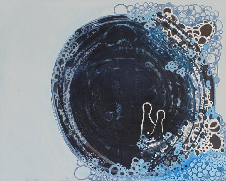 This painting is mixed media, oil and latex, and it began similarly to the first in my "Couples" series set against a matte grey background. However, that had to change, as I continued working it started morphing into a piece surrounded by this thick wall of paint and saturated by these various blu...