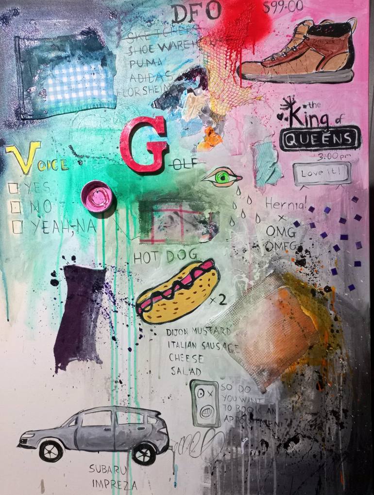 I decided to do a painting about all the things I did in one day. Most of them were just mundane things that I did and saw along the way. Things that I bought like nice shoes, things that I watched on TV such as King of Queens and things that I ate like that yummy hot dog! Oh, and I discovered that...