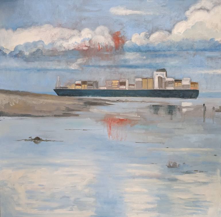 In the spring, I visited Savanna, Georgia.I took my kids to the beach and while enjoying the time on the beach, suddenly we noticed a giant boat cutting through, very close to where we were. The view was amazing and surreal. I decided to paint my experience after returning home.