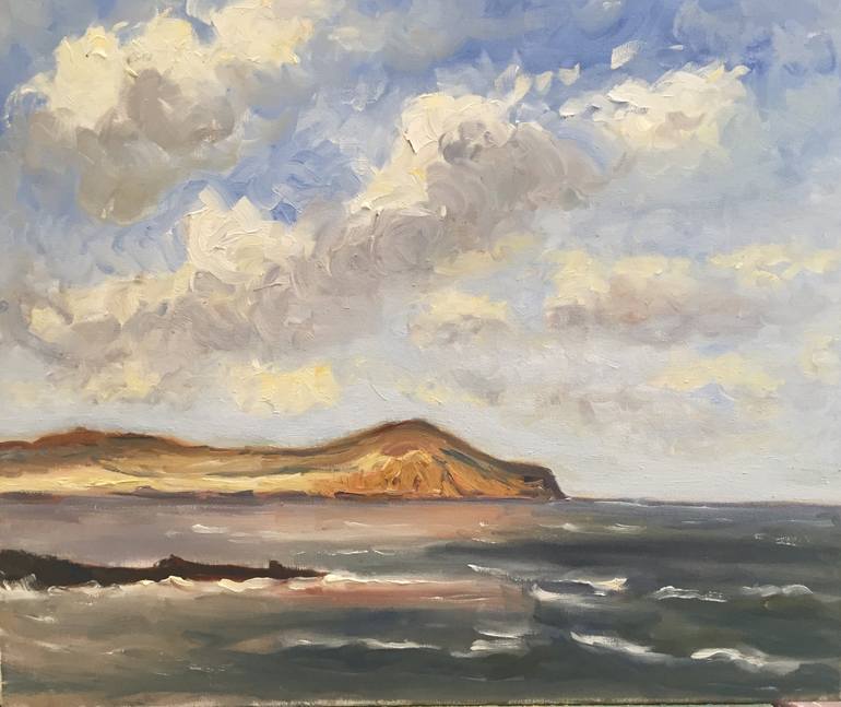 Inspired by Edward Seago’s journey to the Falkland Islands and one of his paintings of the headland. The contrast of sunshine and shadow on land and sea,the sky with its difference in tone between top and the horizon,the majestic cumulus clouds. A study from a landscape master.