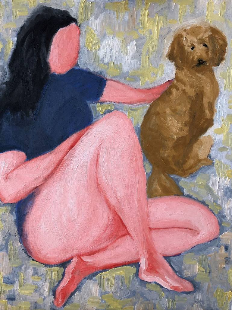 A lazy afternoon in the summer, a young woman petting her dog. Inspired by Sanyu's painting: an exploration of spontaneous, erotic, exaggerated, distorted figures