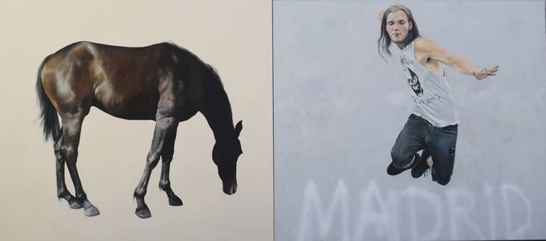 I have recently made a series of small paintings which are diptychs. They vary from being a definable situation with figures against a wall or in some cases, like this painting two canvases creating a narrative by bring together disparate images. The horse in the painting is the same image used in o...