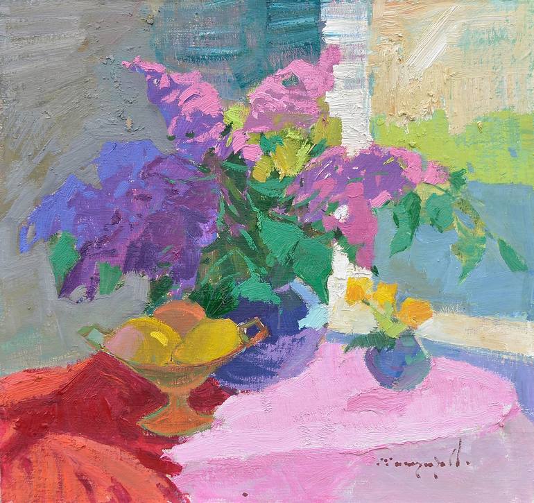 A vivid still life scene features a bouquet of purple and pink flowers in a vase, set against a colorful backdrop. Nearby, a golden fruit bowl is placed on a red cloth, adding to the burst of colors.