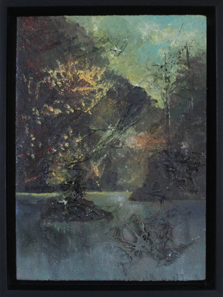 This artwork is a representation of a nature near a river using mixed media.