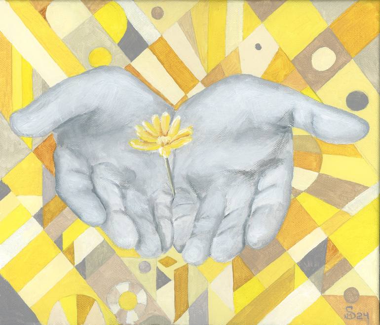 A tender moment captured in time. Two hands, rendered in soft monochrome, gently cradle a vibrant yellow flower. The cubic background, bathed in warm tones, creates a serene and contemplative atmosphere. This minimalist artwork evokes feelings of hope, renewal, and the delicate balance of life. The...
