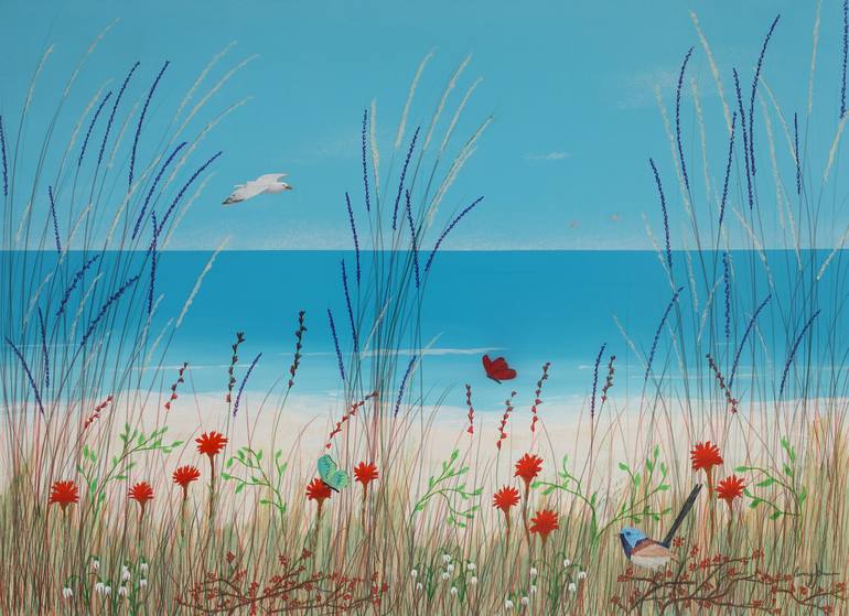 A Peaceful Easy Feeling is a large modern landscape painting of a beach scene with butterflies, birds and wildflowers in vibrant colors of green, blue, red and mauve. In this series of idyllic nature paintings I am trying to create a peaceful calm setting while at the same time producing a colorful ...
