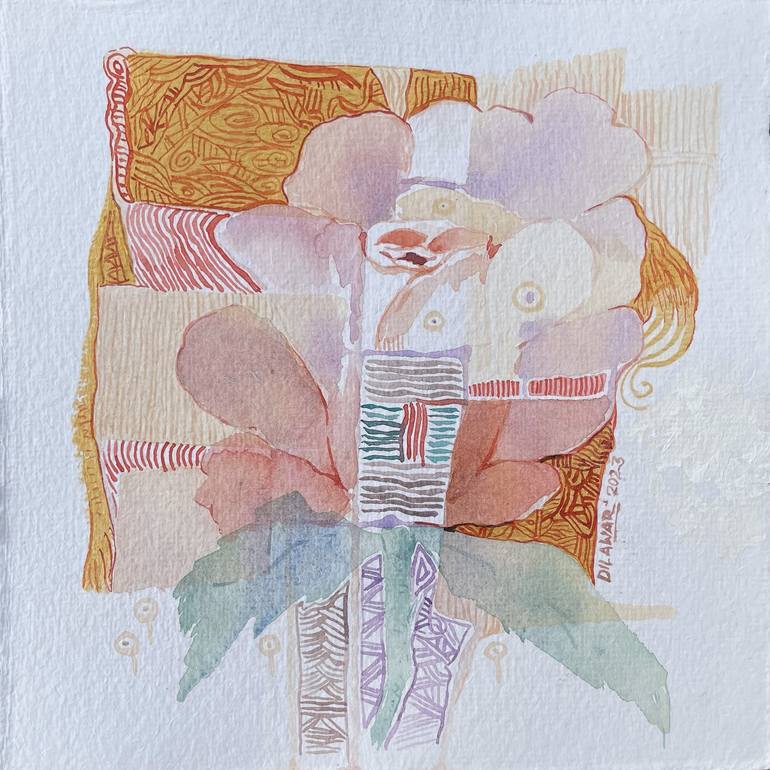 A Rose's Tale captures delicate beauty of roses takes center stage amidst a mesmerizing tapestry of intricate patterns. Soft, translucent hues of pinks and greens blend harmoniously with lines, evoking a sense of elegance and grace. Done on Handmade paper