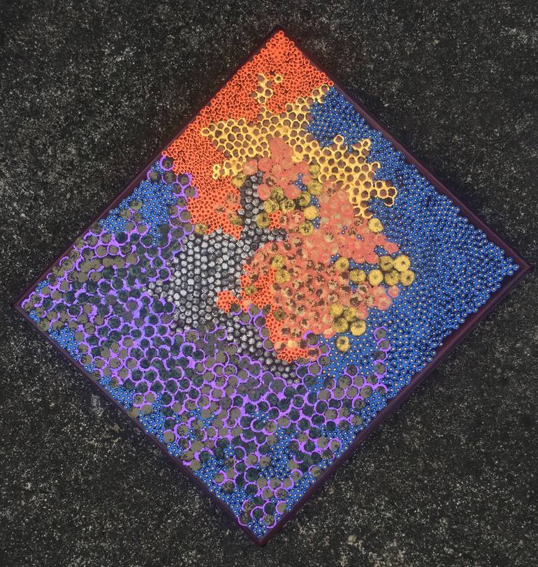 This work employs multiple mediums on a loose-weave-fabric stretched across a designed frame. This frame is one of those that I received from my Dad who worked on Vietnamese traditional lacquered painting and already retired. I continue advancing the method that I developed from the conventional met...