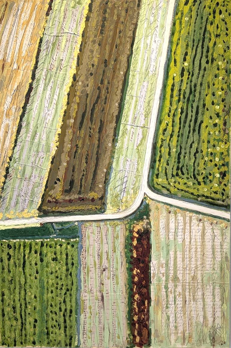 A Turn in the Road is a view of a divided land, palnted over a series of historic land deeds and letters. Part of Listening to the Land Collection the painting offers a bird’s-eye view, rendered in oil on birchwood and layered with pencil marks to add a sense of immediacy and emotion. Together, th...