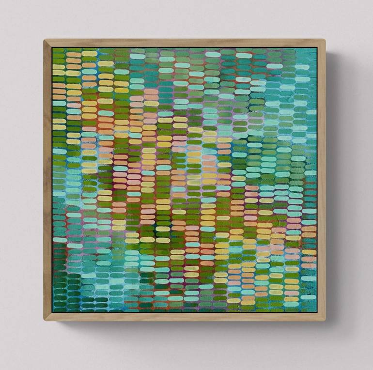 A bright tropical work, with mesmerizing patterns and a pixelated view on a tropical parkland, inspired by the Australian landscape. This work is framed in an Oak floating frame ready to hang. The colours in the Tropical garden series evolved from a large still life of native flowers including ban...