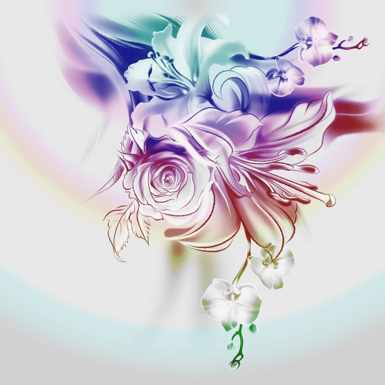 A bouquet of summer flowers. Roses, lilies, orchids. Colored botanical illustration with a rainbow gradient. It reminds me of a wedding card. Vintage style