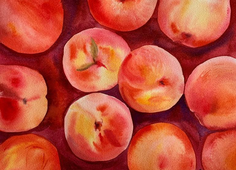 This artwork, titled "A Box of Peaches," is a stunning watercolor painting on 100% cotton paper. It beautifully captures the essence of ripe and juicy peaches. The vibrant colors and meticulous detailing bring these fruits to life, making them almost appear good enough to pluck from the canvas. This...