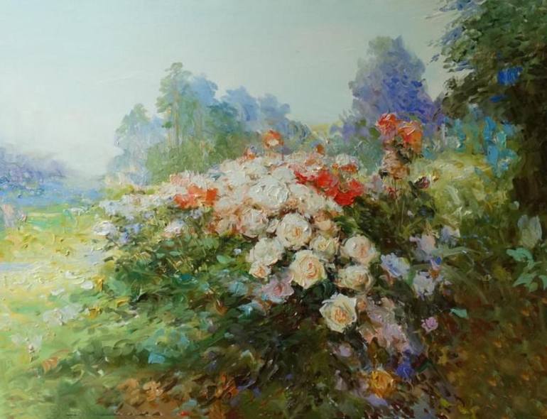 Painting "A bush of blooming roses". As the sun rises, the morning mist gradually fades away. Blooming roses appeared from the fog among the first. Painting for the rest. Original. Canvas, oil. "My paintings portray a dreamy yet dynamic world. I want my paintings to be both an escape from our everyd...
