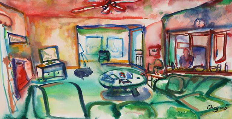 It is a piece of plein air work. The fire place was on, the TV was playing, and the clock was ticking. The man had finished the work of the day and was getting the dinner ready, and dog was just relaxing on the carpet floor. The wind was whistling in the forest and the seals by the sea were making v...
