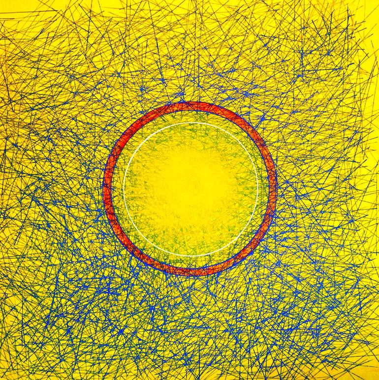This painting is about a climax attempted to be immortalized. I have chosen the 3 primary colors, and the white circle, due to their primordial pigment, and the way it can interact with each other. The yellow stimulates the intelectual part, the blue lines survey all the surface of the canvas, and a...