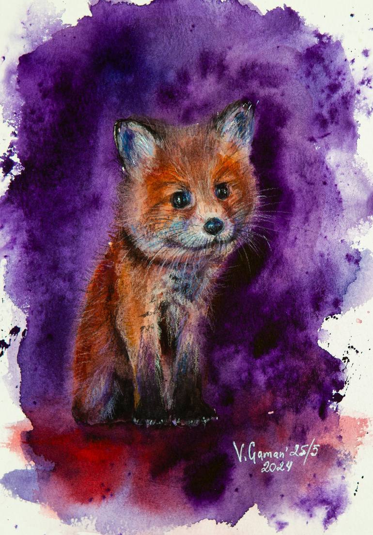 A naughty fox with a guilty look. Watercolor painting. A cute fox on an abstract purple background. Suitable for a child's room. I want my painting to become yours. So that it brings peace and goodness. It doesn't matter what's outside - rain or sun. There will always be a piece of a beautiful world...