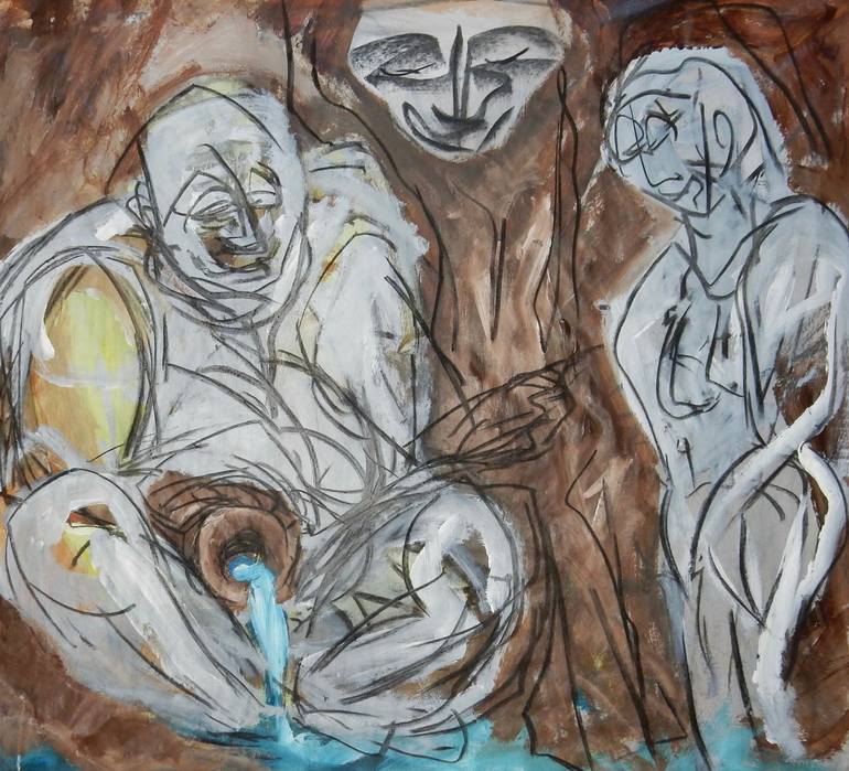 Every day, Urd, Verdandi and Skuld come together at the source of Urd, to take care of the the lifetree Yggdrasil and create the continuation of human life by spinning, measuring and cutting the lifethread of humanity. --- Created on an oversized kraftpaper with margins than either can be cut of, ma...