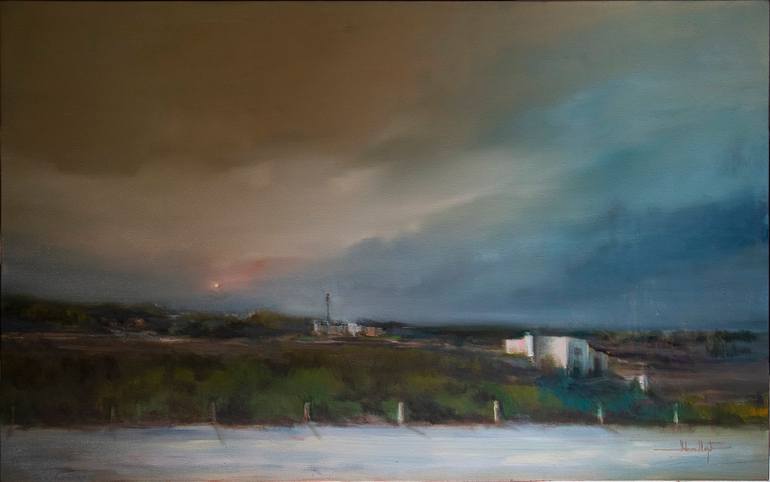 Distant Settlement - is an evocative oil painting that invites viewers into a world of captivating serenity. The artist's deft use of Payne's Grey, Cadmium red/Ochre, and Warm Peach clouds creates an atmospheric overcast that bathes the entire scene in a soft, dreamlike glow. The canvas comes alive ...