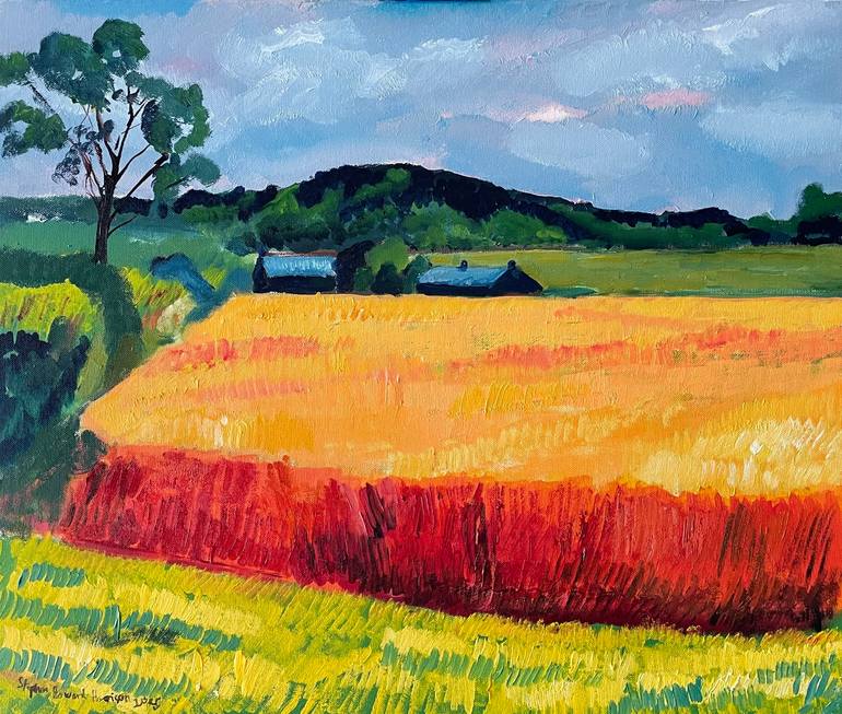 A painting of lush fields in Fife, Scotland. The barley crop is ready to harvest. The colours are warm as is the temperature on this sunny Summer's day. A rural idyll in troubled times. That is what I wanted to convey. Signed on the front, titled and signed again on the back.