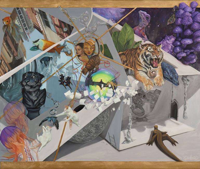 'A full mind' is a visual representation of the dynamic connections between thoughts, memories and stimuli in a busy, creative mind. In this painting creatures and objects roam freely between rooms constructed of paper thin white walls. Within these walled compartments are vast worlds to roam and ...