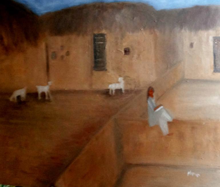 Girl from a village reading her textbook. Between two worlds she lingers.