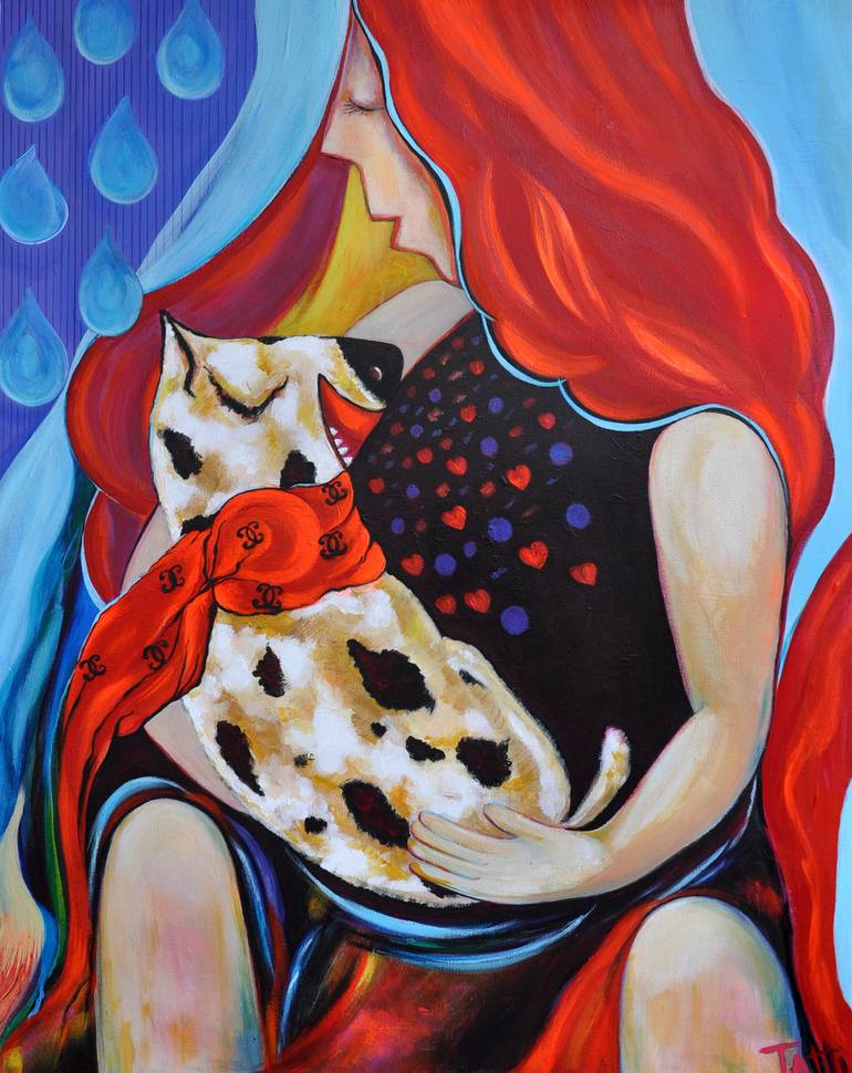 Dalmatian baby dog is sleeping in arms of a girl with red hair. The painting transmits peace and quiet and happy feelings. I love strong colours red and blue, they show my strong emotions and a passion.