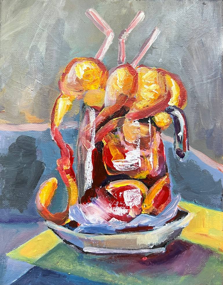 This vibrant acrylic painting, inspired by the style of Henri Matisse, features a striking still life composition. At the center of the canvas is a delicately painted pitcher adorned with intricate orange slices and peels around its neck. The vivid oranges, rendered with bold brushstrokes and rich h...