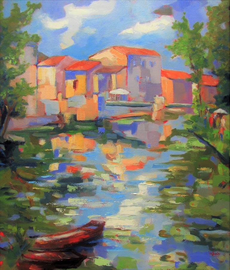 "A quiet Sunday by the river" is an oil painting that captures a peaceful moment in time. The artist's impressionistic style brings to life a lazy summer Sunday in a small village, with careful attention paid to the reflections in the water. The figurative subject depicts a riverside scene with boat...