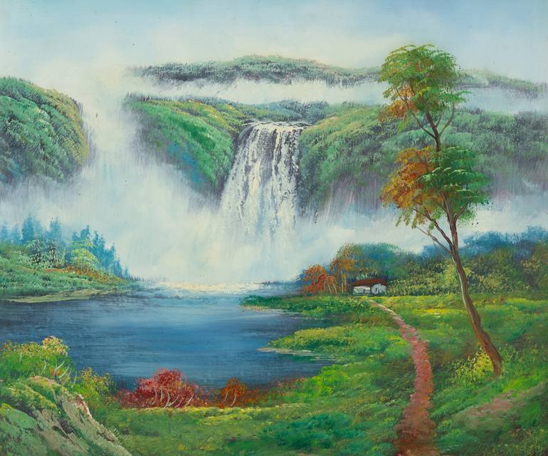 The painting is a landscape dominated by a powerful waterfall that tumbles down from a high, misty mountain in the background. The mountain is densely covered with rich green foliage, creating a sense of depth and scale. A soft, ethereal mist hangs in the air, particularly around the waterfall, giv...