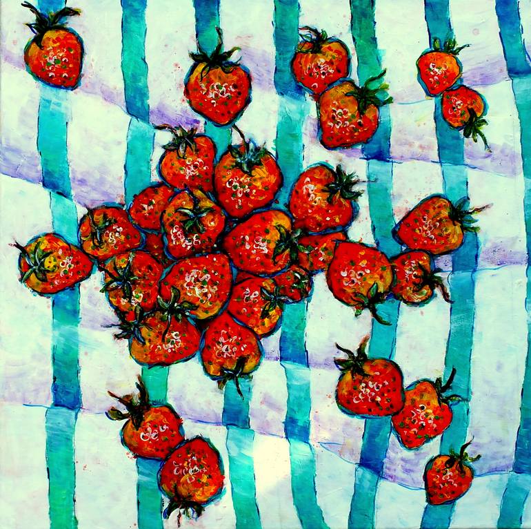 This is my second painting inspired by the works of the great Henry Matisse. Simple repetitive shapes of scrumptious strawberries elevated to the surface of the canvas by the contrasting Turquoise blue of the lines of the 'tablecloth', together with contrasting warm and cool colours.