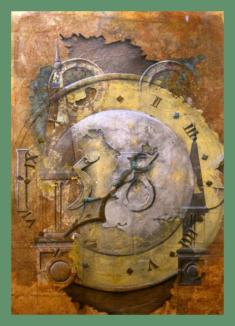 This image was inspired by an ornamental clock/sundial on the roof of Burghley House in Lincolnshire. This is an abstract interpretation which emphasises the history and architectural importance of this exquisite Tudor structure. The choice of media, including patinated Dutch metal, Artex and powder...