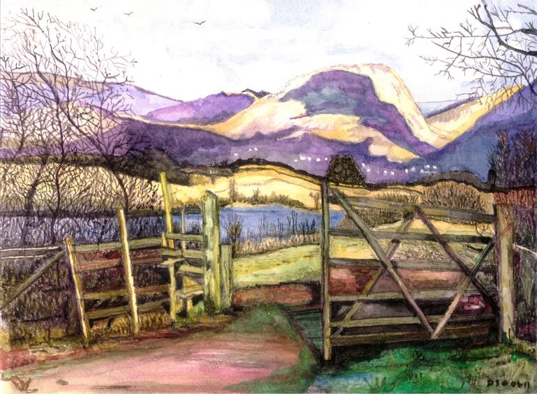 A view through a gate and stile, across the tarn to the villages and moorland hills beyond