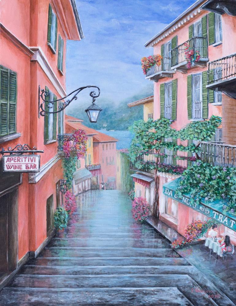 A walk after the rain. Bellagio This is a painting from the series Romantic Cities of the World. Bellagio is a very beautiful town in Italy. It is located at the shores of Lake Como. It is a pleasure to stroll through the cobble streets, admiring the elegant buildings and the view of the lake. I c...