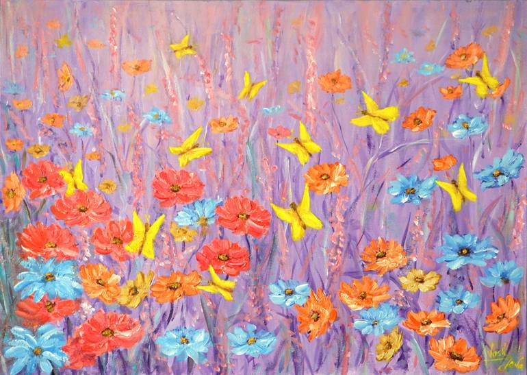 "A Wonderful Start to the Day" captures the serene beauty of a quiet morning at dawn. Delicate yellow butterflies flutter gracefully over a vibrant flowering meadow. The flowers, painted with gentle strokes of color, seem to sway in the early breeze, adding a sense of peaceful movement. Created wit...