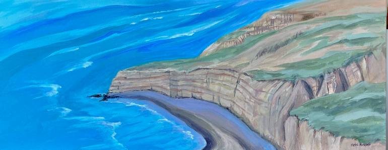 Introducing "ABOVE TORREY PINES BEACH," an enchanting original impressionist acrylic painting crafted by the talented artist, Heidi Heiser. This captivating piece measures 40 x 16 inches and is skillfully stretched on high-quality canvas with solid wood stretchers, ensuring its durability and longev...