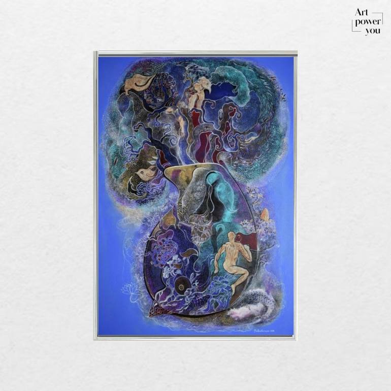 This captivating acrylic-on-canvas artwork by Madhu Kuruva explores the mystical interplay of nature, humanity, and spirituality. With a deep blue palette and intricate, flowing patterns, the piece evokes a sense of transcendence and interconnectedness. Ethereal figures merge with organic textures, ...