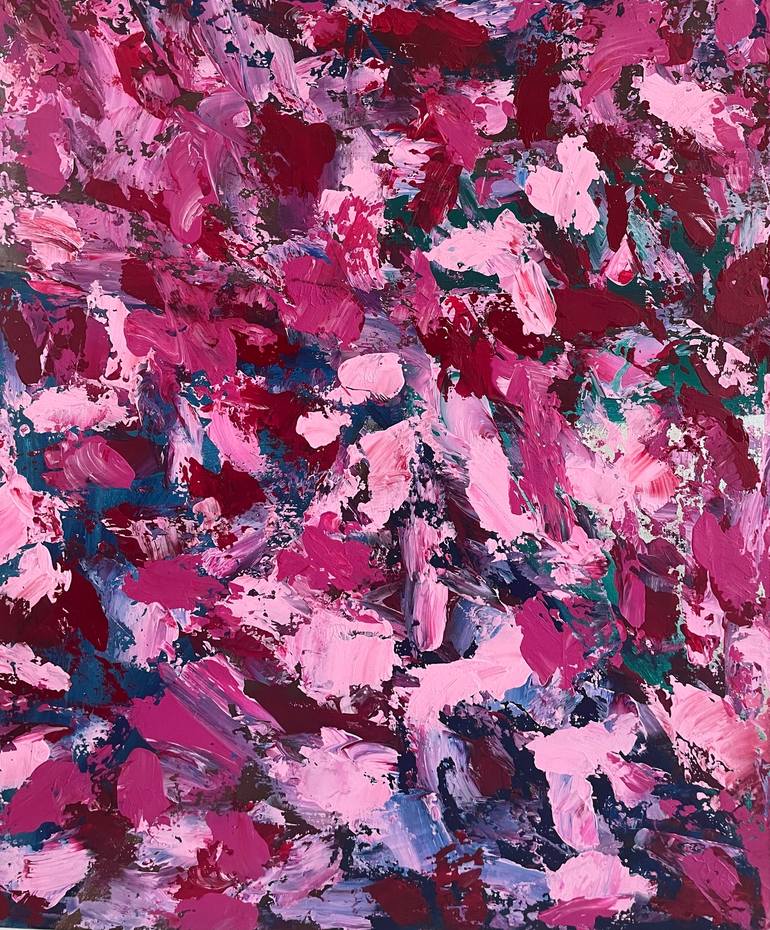 Sensual smooth brush strokes of rose and fuscia colors stand for kisses. Some are short and energetic, others are longer and softer. A full pallette of what we feel and experience when we are close with the one person we love. Acrylic on canvas panel, varnished Sold unframed Can be hung vertically ...