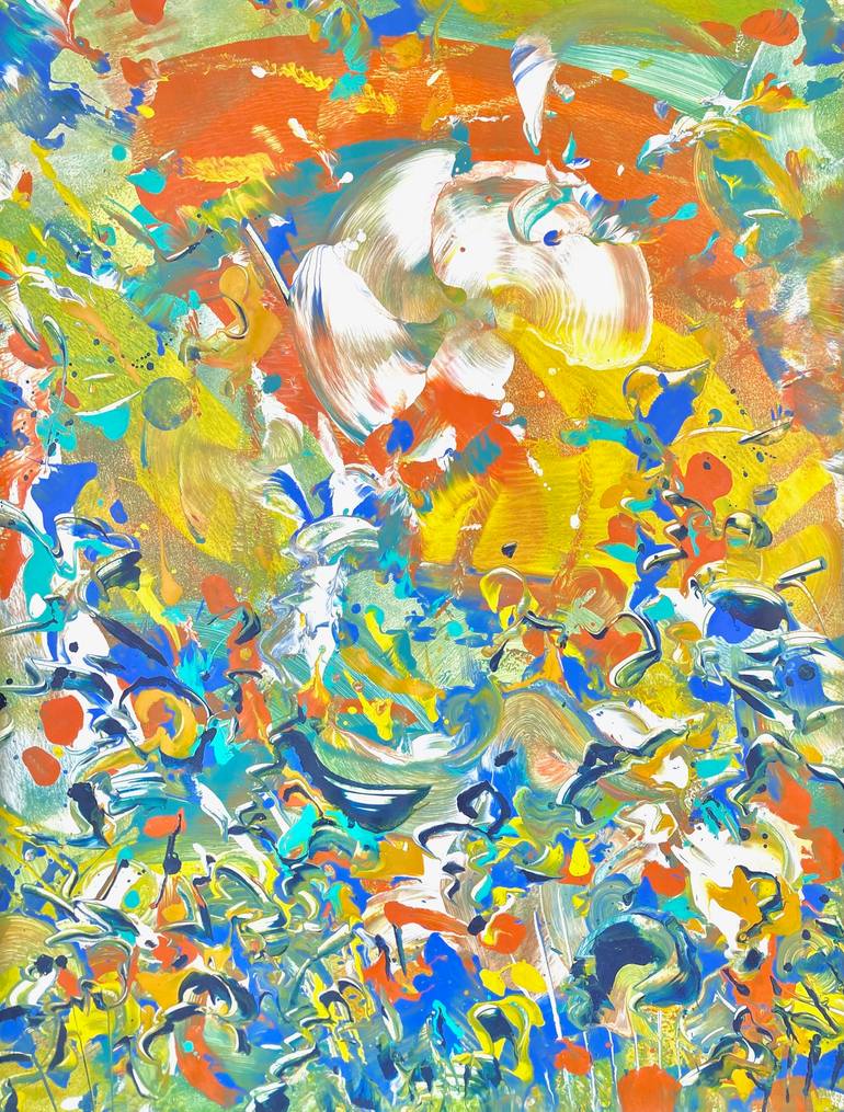 Watch the video of the painting coming to life! "Ascension" commands attention with its dramatic composition. A circular white movement dominates the upper portion against a backdrop of bright orange and yellow, drawing the eye with its compelling presence. Below, indigo, turquoise, and dark blue s...