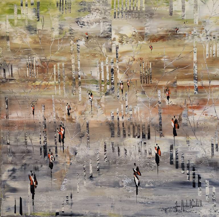 DETAILS OF THE ARTWORK ON YOUTUBE : https://www.youtube.com/shorts/2eccgXNhDt0 ABSTRACT LANDSCAPE, THE SILHOUETTES BRING A FIGURATIVE AND HUMAN TOUCH TO THE WORK. ACRYLIC ON CANVAS, THE BACKGROUND WAS DONE WITH A BRUSH, THE SILHOUETTES WITH A KNIFE, THE EDGE OF THE WORK IS PAINTED IN BLACK, TOP QU...