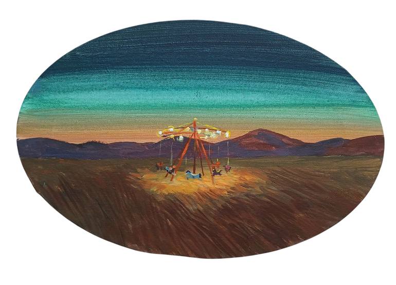 The painting depicts an abandoned carousel standing eerily in a dark overgrown field,resembling an object from another world. Its mysterious aura resonates with the mystique of twilight, evoking a sense of forgotten dreams and lost joy.