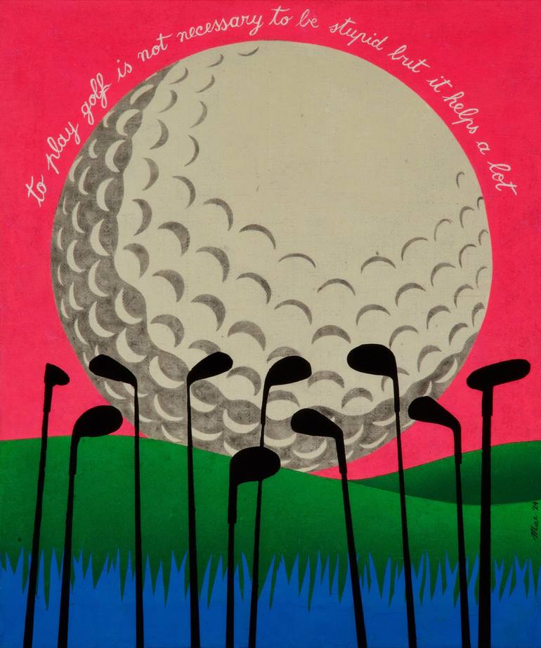 Acrylic, gesso, plaster and phosphorescent pigments on jute canvas. Stretched on handcrafted frame, unframed, ready to hang. The phrase hovering over the golf ball is a quote from George Bernard Shaw. The golf ball is phosphorescent.